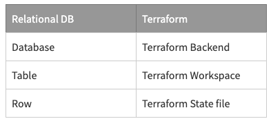 A simple relational database analogy provided in the table below can be used to understand the relationship between Terraform State, Workspaces and Backend.