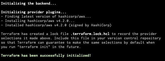 terraform initYou should see a message such as the below. Terraform pins provider versions using the terraform lock file so that you see a consistent experience across multiple initations of the module.